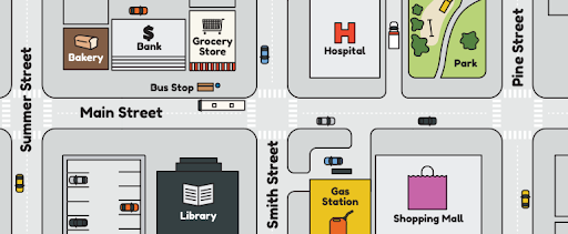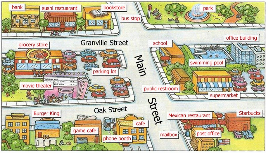 Directions: With a partner, take turns politely asking for the location of the shops and building in this neighborhood.